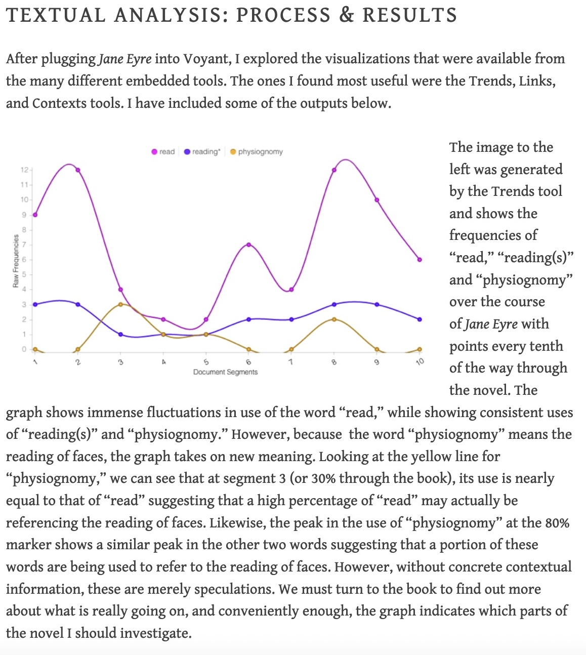 Analyzing the text of Jane Eyre to discover trends in how words about literacy were used to understand 19th century attitudes to women and reading, created by an English and Psychology double major. Explore the project website