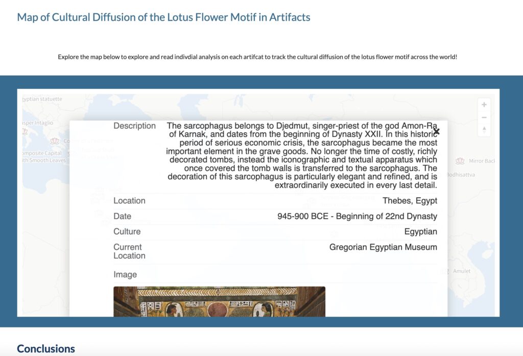 Interactive map showcasing examples of the lotus flower motif in museum objects across the world, created by an Anthropology major. Explore the project website